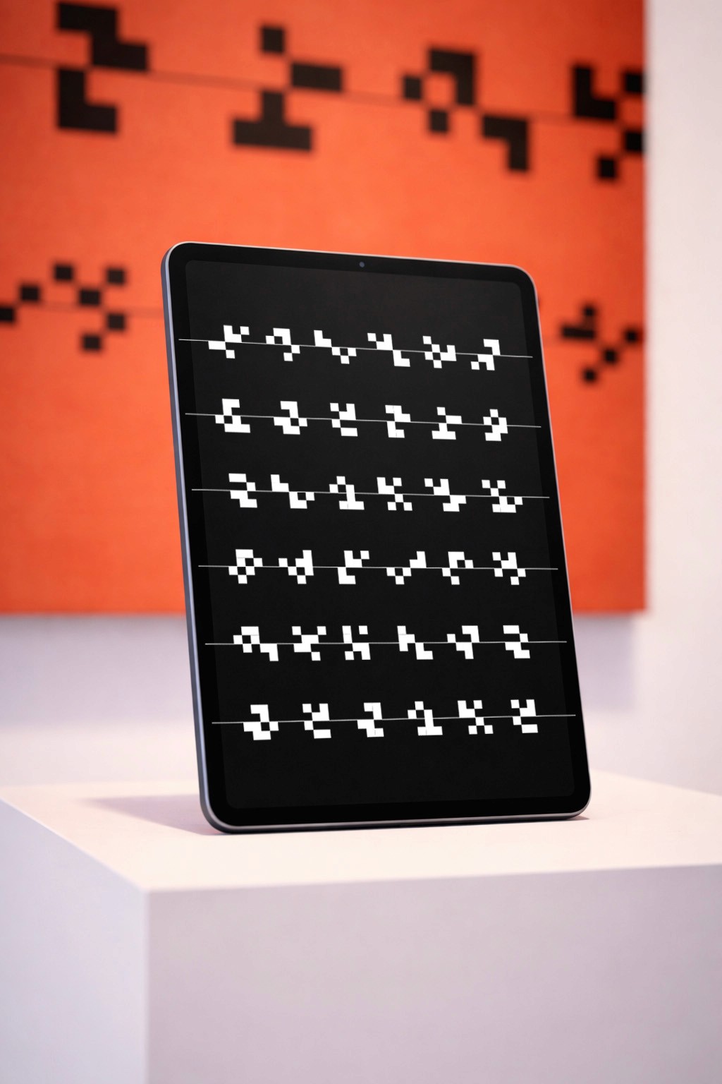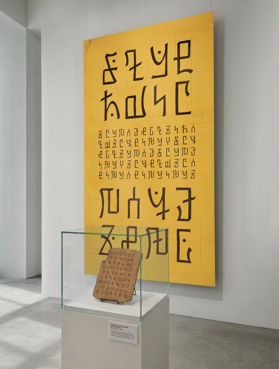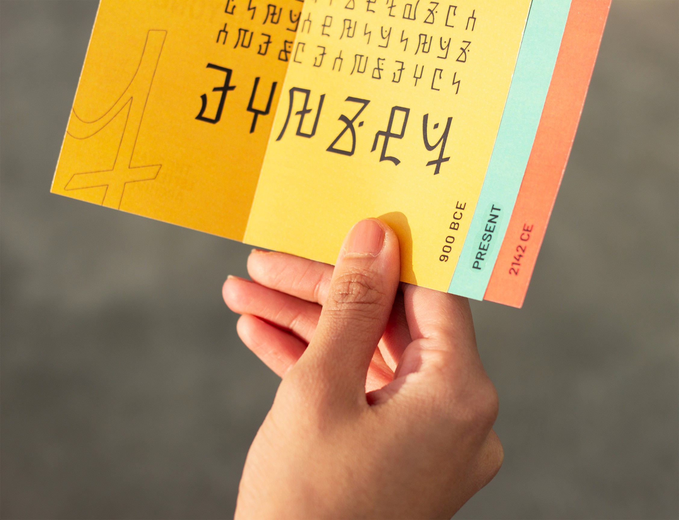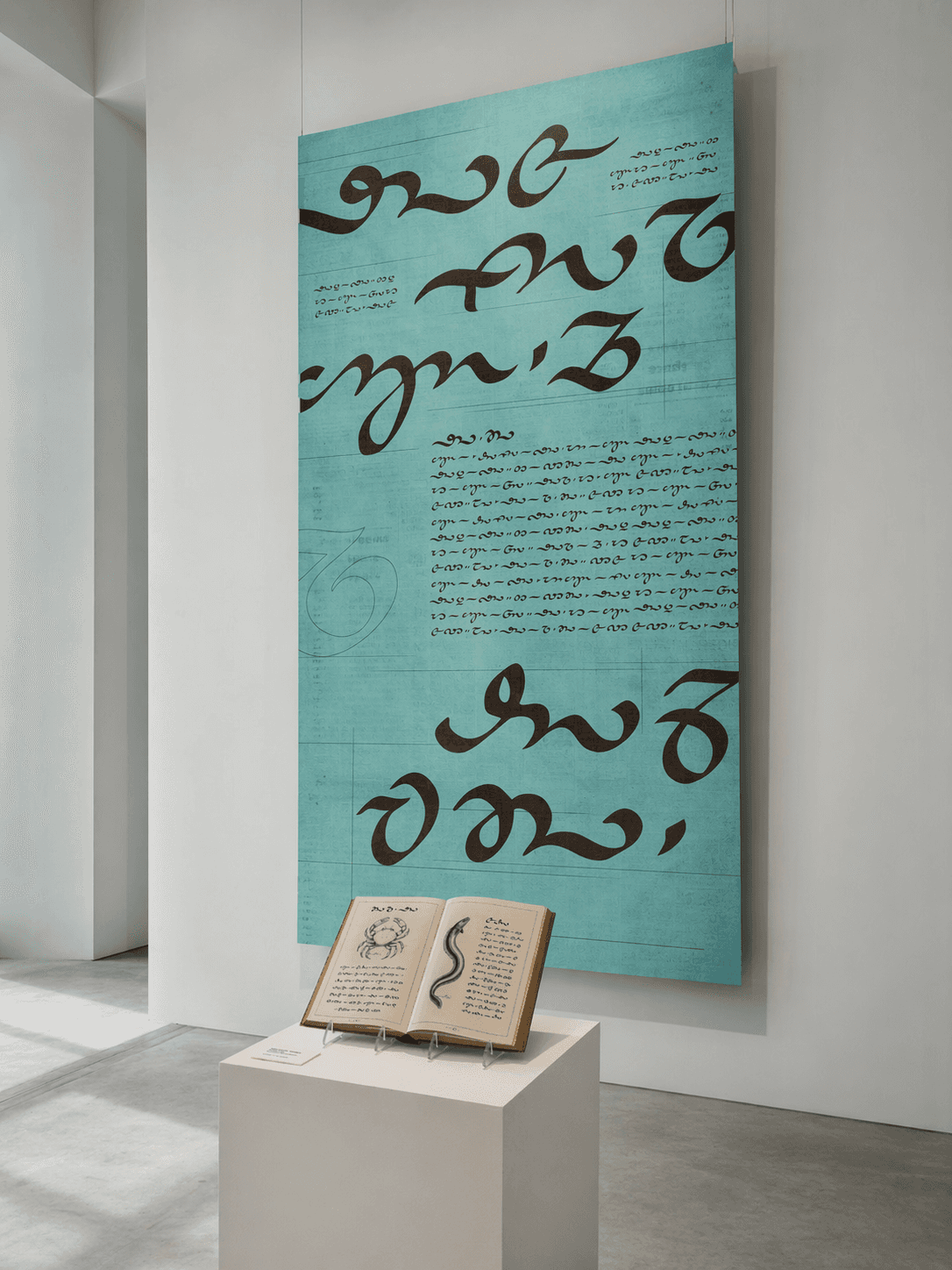 As part of my thesis at MICA, I designed three original asemic scripts, one each from the past, present, and future, built around a specific world and context, letting the writing system emerge naturally from it. Spanning visual identity system, typography, and exhibition design, the project explores what makes a writing system feel real, and whether legibility and meaning are as connected as we assume.