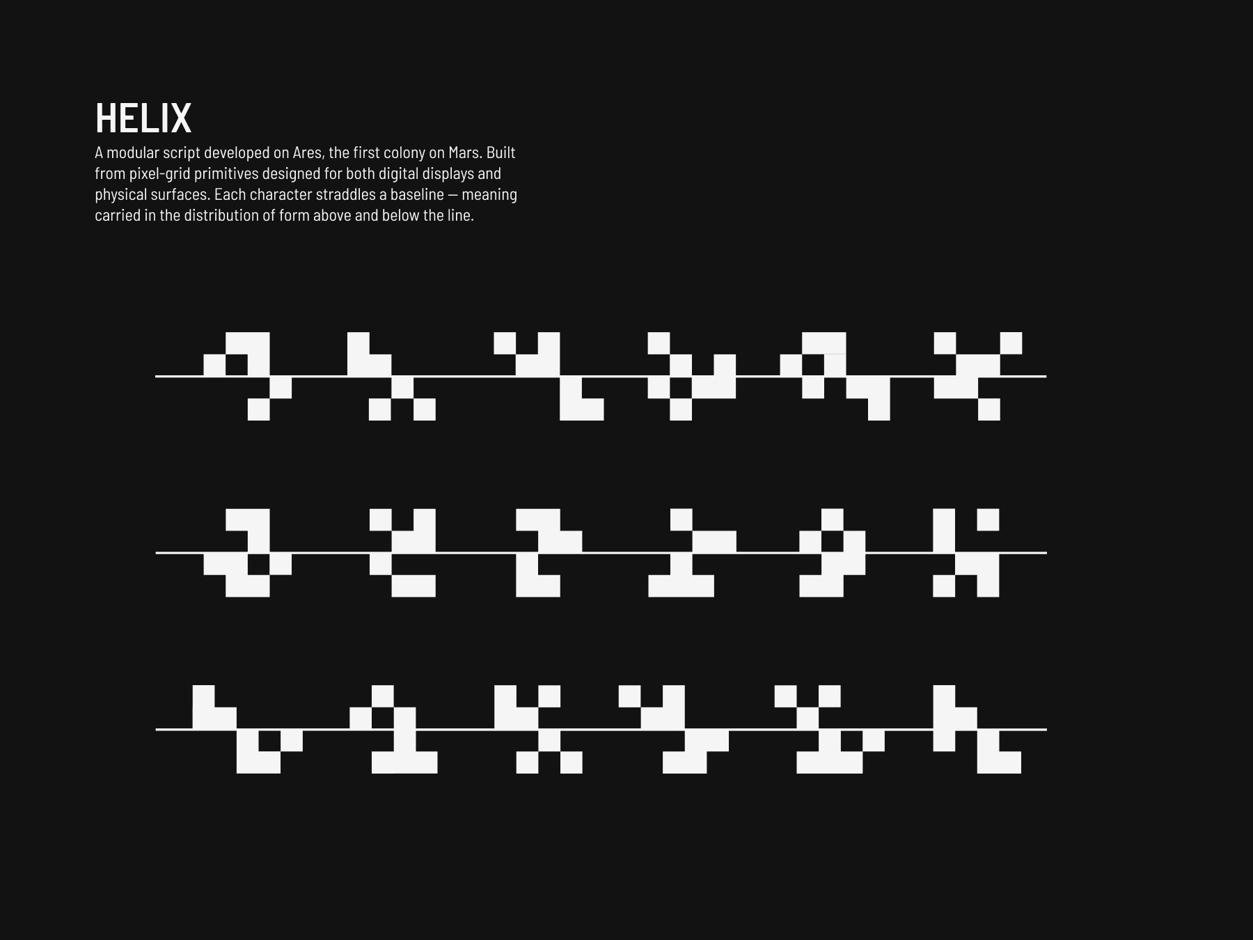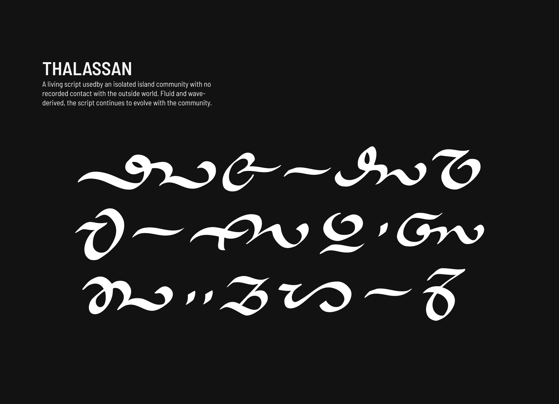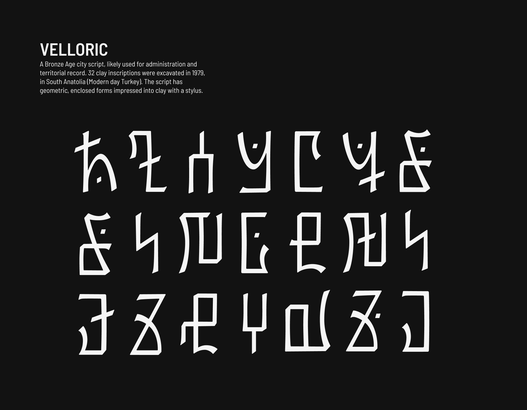 For this project, I designed three original scripts — one each for the past, present, and future. Velloric is a Bronze Age city script, pressed into clay tablets in Southern Anatolia. The second is a contemporary script from an isolated island community, its glyphs shaped by the sea creatures that surrounded them. The third is a colony notation system from Mars, evolved so far from any Earth language that the connection has been entirely lost.
