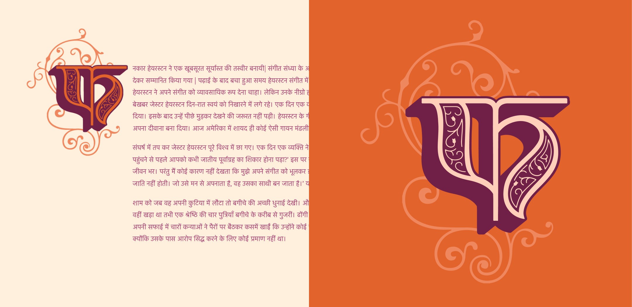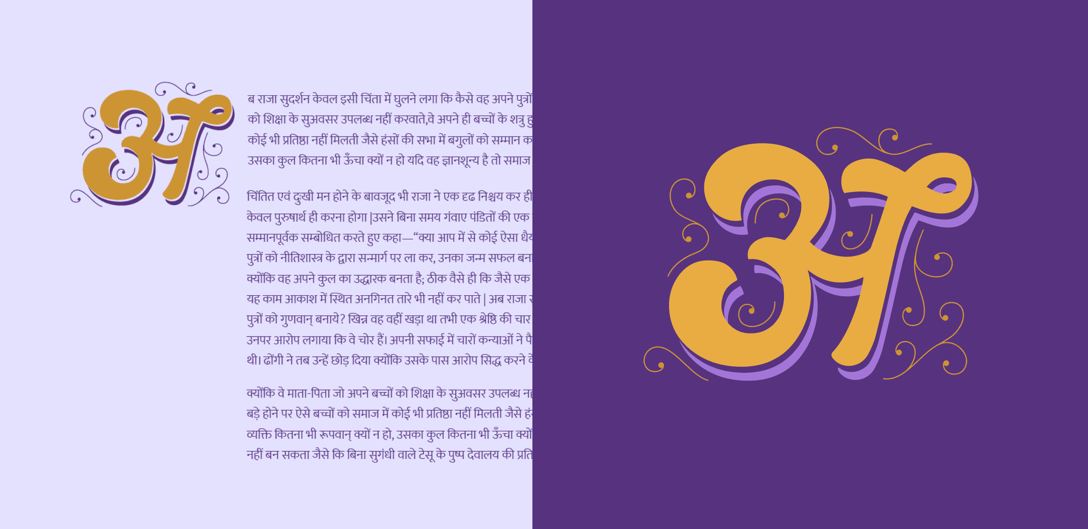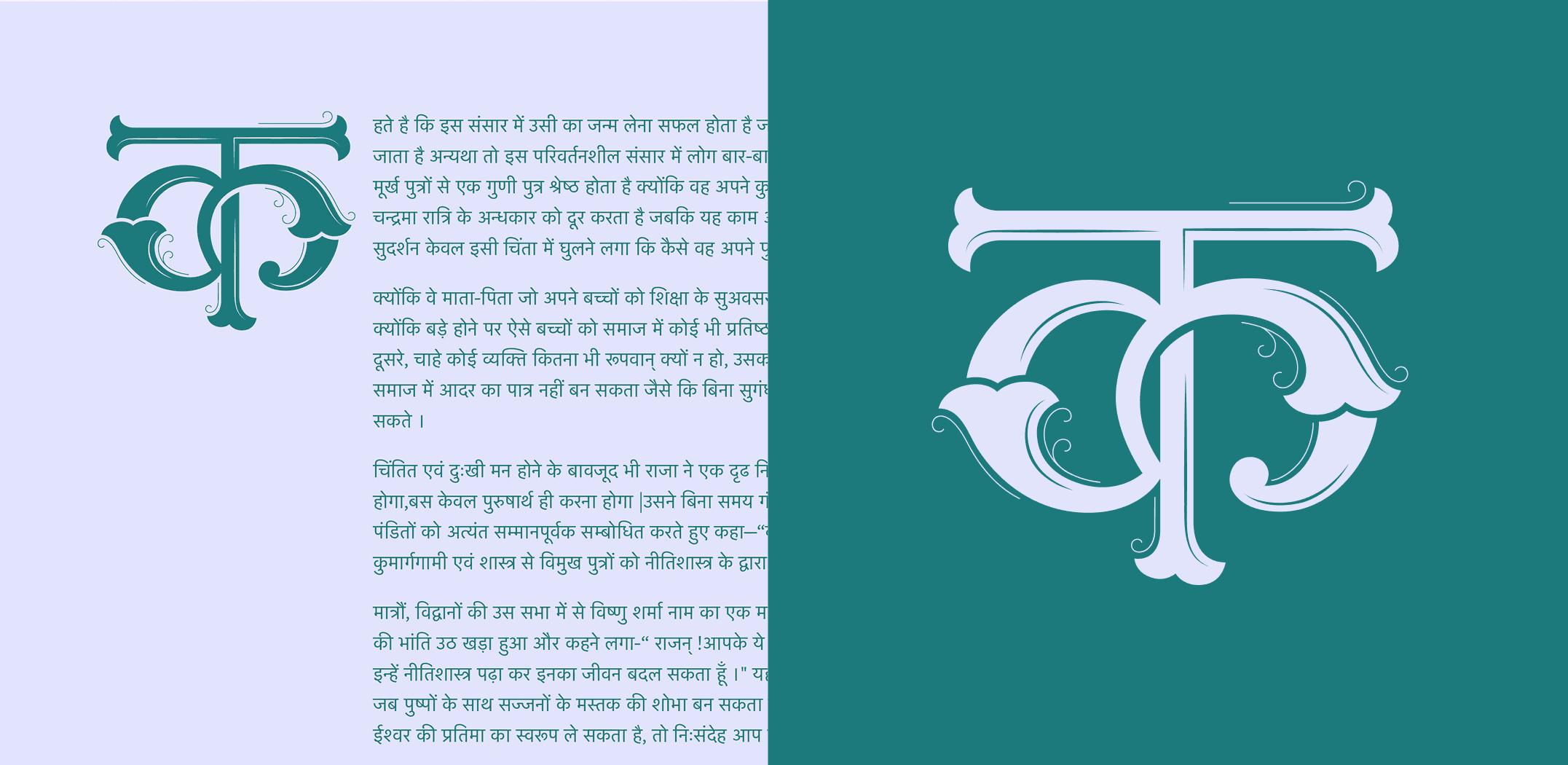For my graduation project, I designed Devanagari drop caps or decorative initials—a design element traditionally associated with Latin scripts. This project allowed me to delve into the beauty and versatility of Devanagari letterforms, and to apply decorative and functional typographic techniques to a script that is less commonly explored in this context. The process began with four weeks of intensive calligraphy practice, helping me develop a deeper understanding of the letterforms.